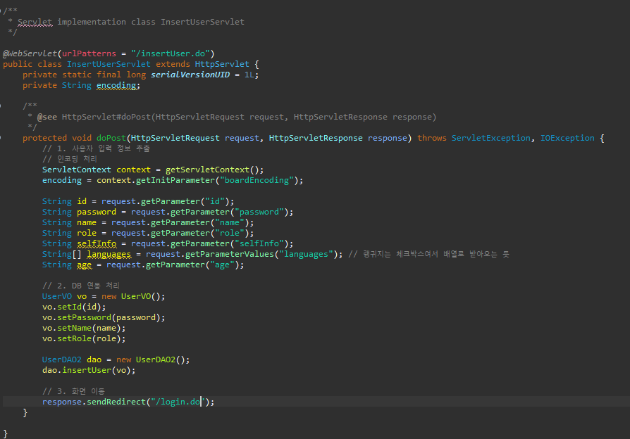 유저 추가(InsertUserServlet)을 요청(/insertUser.do)하면 insertUserServlet에서는 사용자 유저 추가 기능을 처리한 후에