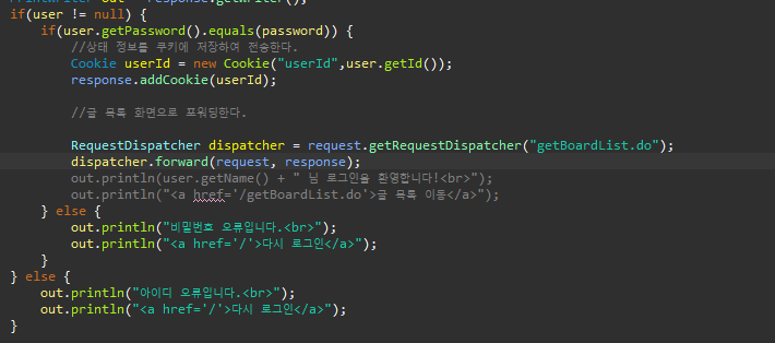 user가 null이 아니면서 비밀번호가 일치하면 로그인이 수행된 것이다.