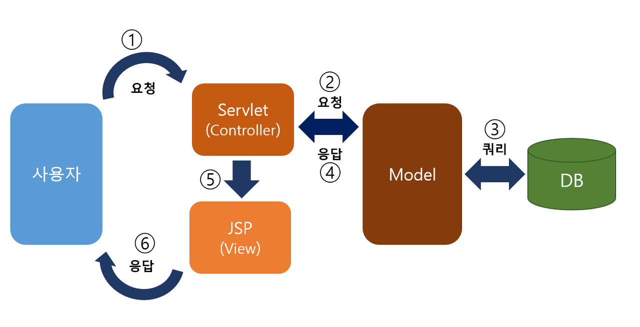 - view 코드와 로직처리 코드가 분리되어있어 JSP는 Model1에 비해 복잡하지 않다.