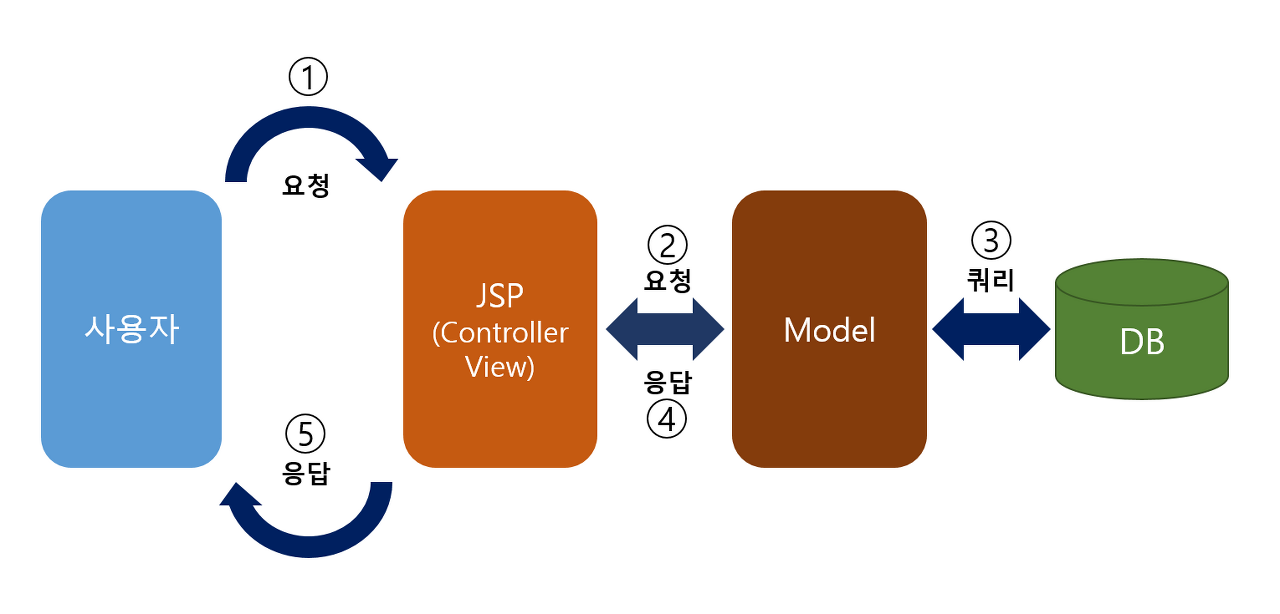 뷰와 컨트롤러의 로직을 jsp로 한 번에 처리하는 구조로, client로부터 요청이 들어오면 JSP는 DAO, beans, Service 등의 클래스를 이용하여 작업을 처리하고 결과를 브라우저에 표현하는 방식이다.