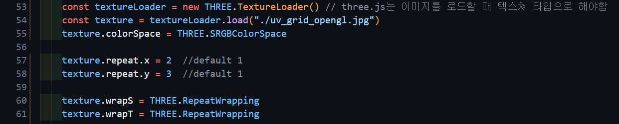 이미지를 로드해서 저장한 texture 값의 반복 횟수와 wrapping을 설정해 주는 코드이다.
