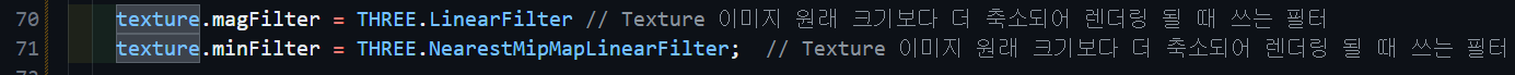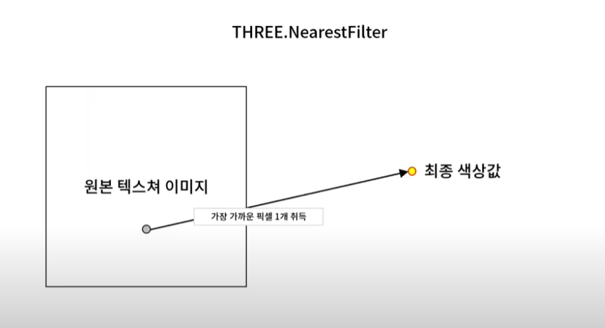 texture.magFilter = THREE.LinearFilter // Texture 이미지 원래 크기보다 더 축소되어 렌더링 될 때 쓰는 필터