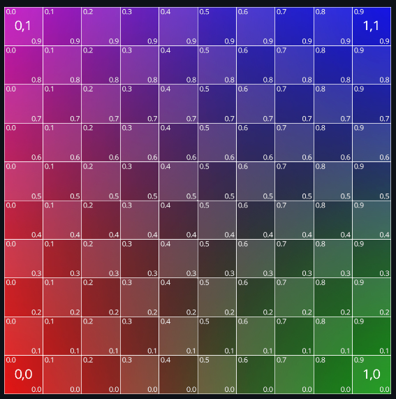 위에서 사용했던 이미지(uv_grid_opengl.jpg)는 Three.js에서의 UV 좌표를 보여준다.