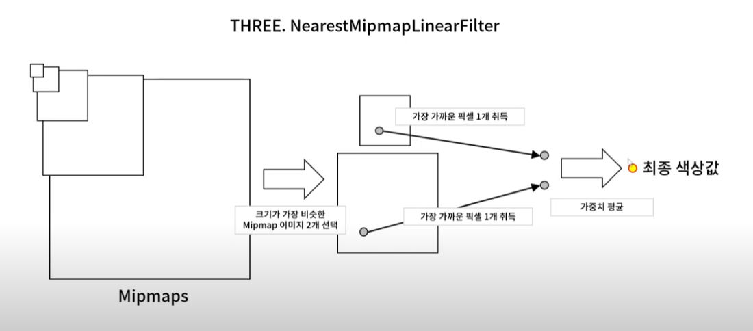 texture.minFilter = THREE.LinearMipMapLinearFilter // Texture 이미지 원래 크기보다 더 축소되어 렌더링 될 때 쓰는 필터
