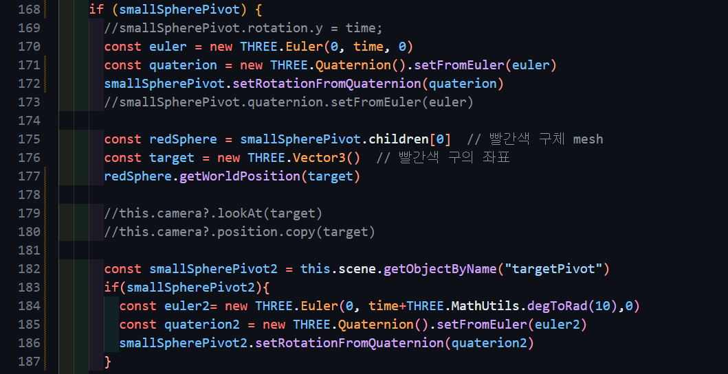 const targetPos = smallSpherePivot2.children[0] // target Object3D 객체