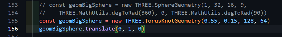 위와 같이 SphereGeometry에서 TorusKnotGeometry (토러스 매듭 or 연환면 연환)로 변경한다.